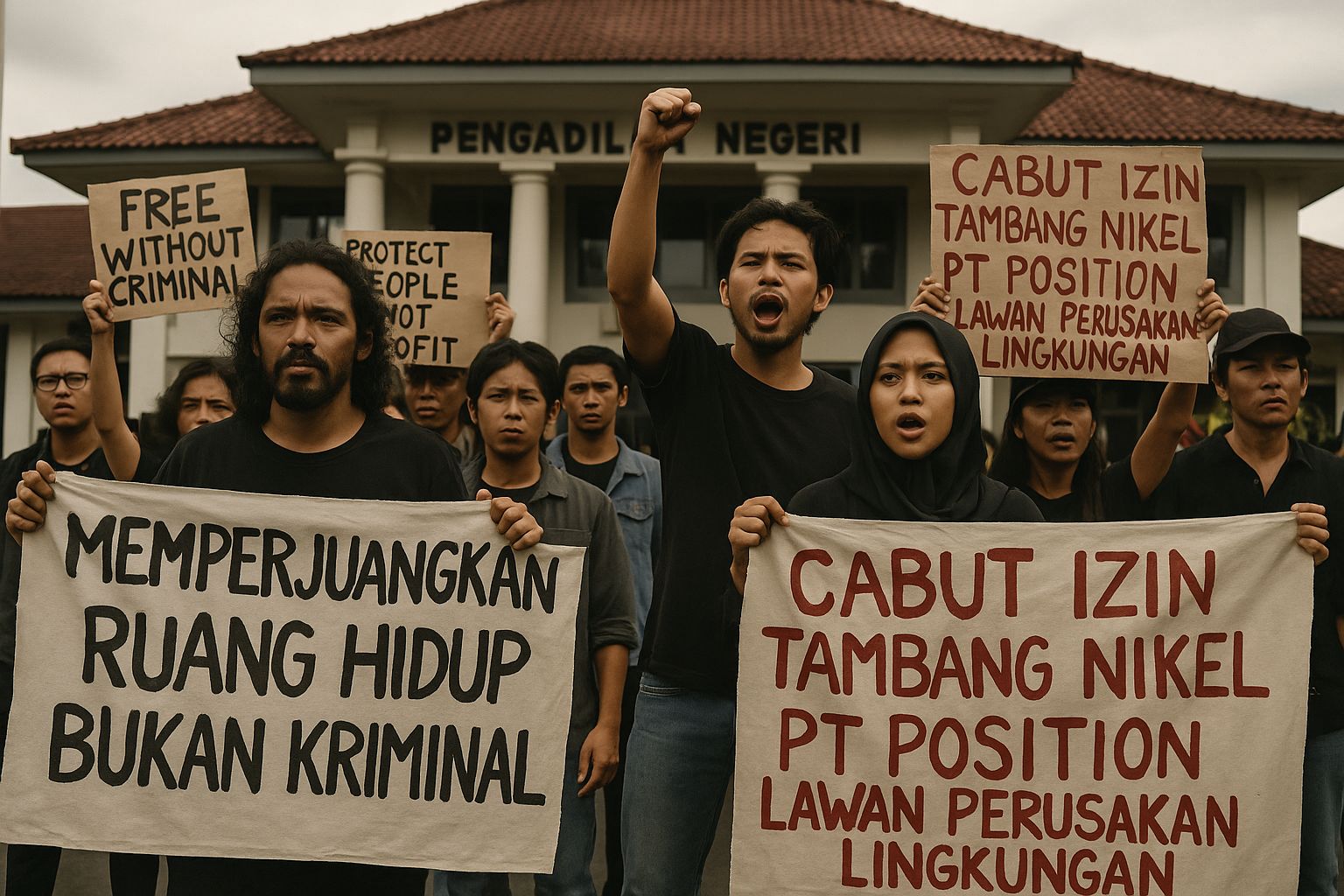 Teriakan-teriakan terus menggema. “Bebaskan tanpa syarat!” “Cabut izin PT Position!”—suara-suara itu memantul di dinding gedung pengadilan, seakan mencoba menembus ruang sidang. Bagi mereka, perjuangan ini bukan hanya soal membela 11 orang, tapi membela masa depan hutan, air, dan kehidupan yang bergantung padanya.