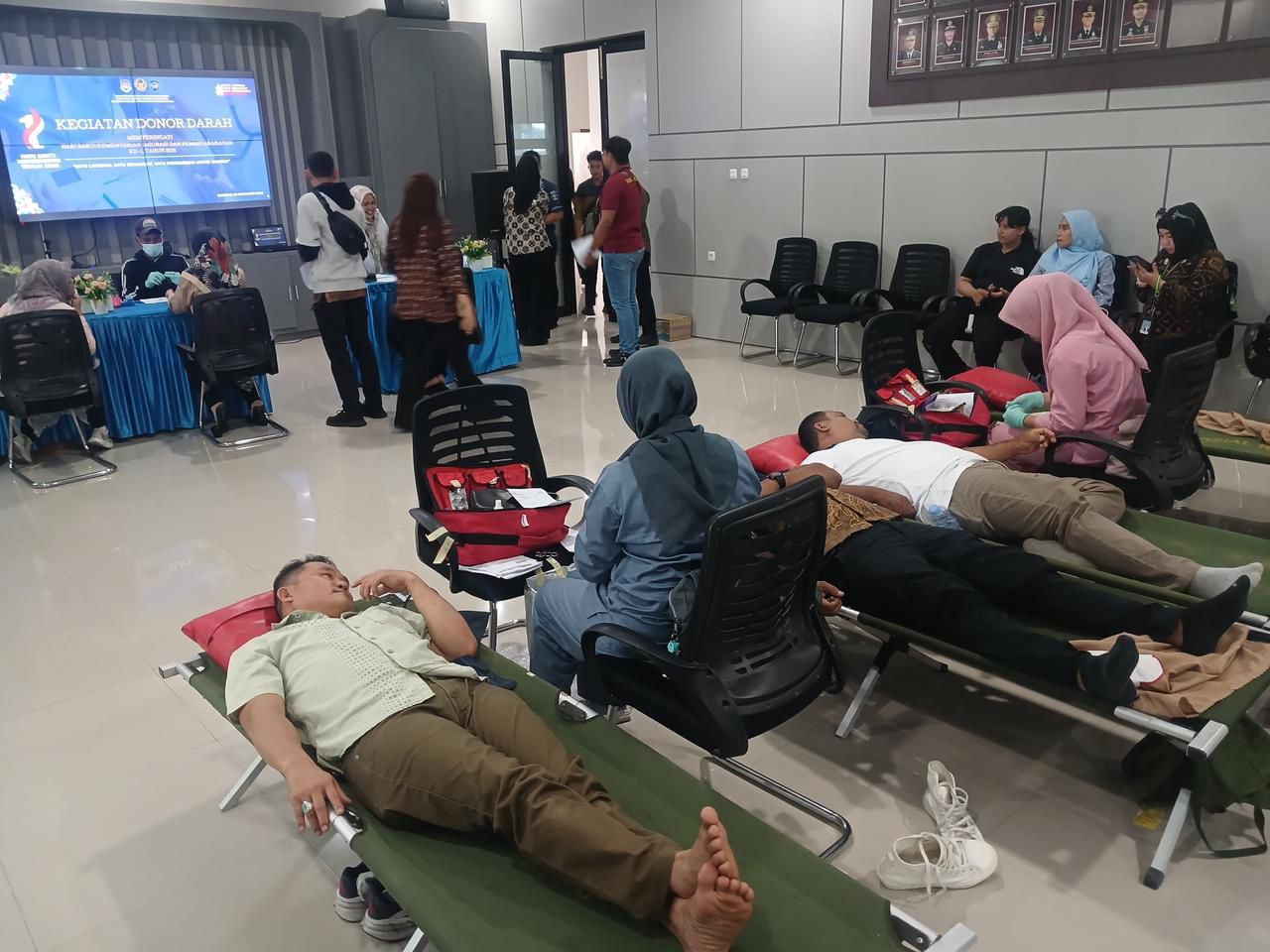 Beberapa pegawai tampak gugup, sebagian lain santai, namun semuanya datang dengan niat tulus membantu sesama. Suasana hangat terlihat ketika petugas PMI memberi arahan, disambut senyum para pendonor yang bergantian mengambil tempat di kursi donor.