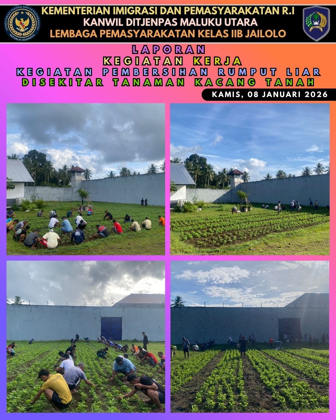HALBAR, DM- Program pembinaan kemandirian terus dijalankan Lembaga Pemasyarakatan (Lapas) Kelas IIB Jailolo. Pada Kamis (8/1/2026), Warga Binaan Pemasyarakatan (WBP) melaksanakan kegiatan pembersihan rumput liar di sekitar tanaman kacang tanah sebagai bagian dari pembinaan di sektor pertanian.
