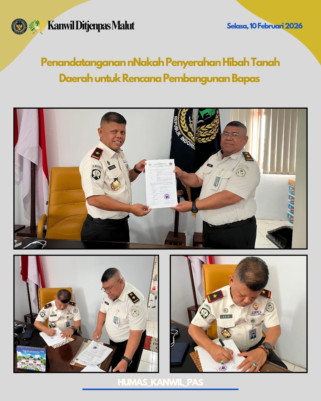 Ternate, DM Kantor Wilayah Direktorat Jenderal Pemasyarakatan (Ditjenpas) Maluku Utara menerima penyerahan draft hibah tanah daerah dari Pemerintah Kabupaten Halmahera Timur sebagai langkah awal rencana pembangunan Balai Pemasyarakatan (Bapas). Kegiatan tersebut berlangsung pada Selasa, 10 Februari 2026, sekitar pukul 09.00 WIT di Kantor Wilayah Ditjenpas Maluku Utara.
