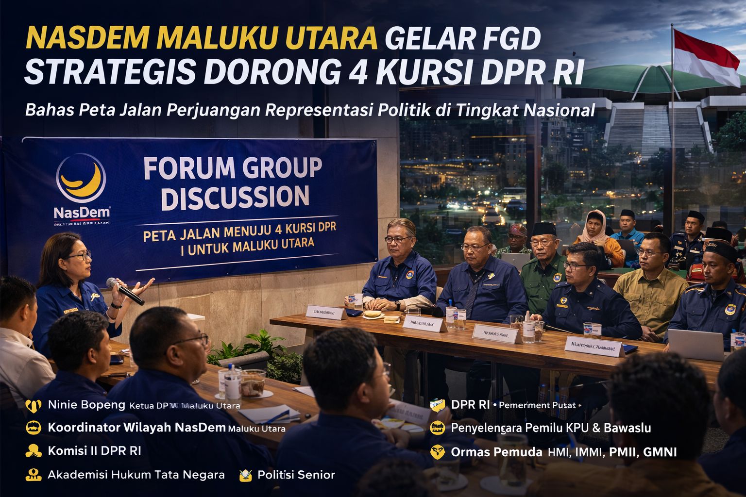 TERNATE, DM – Dewan Pimpinan Wilayah (DPW) Partai NasDem Provinsi Maluku Utara akan menggelar Forum Group Discussion (FGD) strategis bertajuk “Peta Jalan Menuju 4 Kursi DPR RI untuk Maluku Utara” pada Selasa malam, 7 April 2026, di Cafe Restorasi DPW NasDem Maluku Utara.